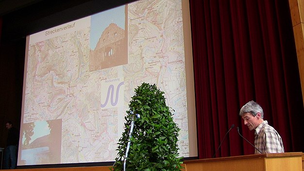 Vom Schollerbuckel führte die Eröffnungswanderung weiter über die Teufelskanzel und die Lautenbach zur Schleuse Rockenau. Dort wartete ein Bus, der die Wanderer in Pendelfahrten zurück nach Eberbach brachte. In der Stadthalle wurden die Eröffnungsgäste bewirtet, und im großen Saal präsentierten sich touristische Ziele am Neckarsteig mit Infoständen. Am Nachmittag gab es dann noch Grußworte, unter anderem von Landrat Dr. Achim Brötel und dem Landtagsabgeordneten Georg Nelius. Timo Bracht freute sich, dass die Idee, die er vor über fünf Jahren hatte, nun Wirklichkeit geworden ist und wünschte sich für den Neckarsteig nichts Geringeres, als dass er "einfach der schönste Wanderweg Deutschlands" sein möge. Naturpark-Geschäftsführer Manfred Robens erläuterte mit einer Leinwandpräsentation den Streckenverlauf und gab weitere Informationen zum Neckarsteig. Die Region verspricht sich von dem zertifizierten Wanderweg neue touristische Impulse.
