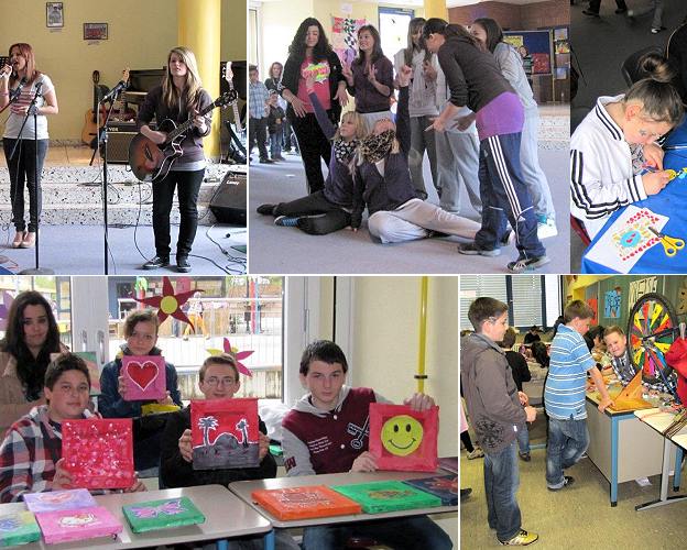 Die einzelnen Klassen und die AGs der Ganztagsbetreuung bereicherten unter anderem das Fest mit verschiedenen musikalischen und tänzerischen Darbietungen. Kreativ gestalten konnte man Buttons und Kunstkarten, oder man konnte sich beim Origamifalten betätigen. Ob beim Kraftmeiern am Baumstamm, beim Basteln mit Holz, einer Pflanzaktion an der Kräuterspirale im Schulgarten, bei den chemisch-, physikalischen Experimenten, beim Kinderschminken oder in der Schulküche, überall in der Schule herrschte ein fröhliches Treiben. Großen Andrang fand auch das Klassenzimmer, das in eine Spielhölle verwandelt wurde. Dort konnte man seine Treffsicherheit beim Münzen-, und Dosenwerfen, beim Dart oder am Glücksrad ausprobieren.
