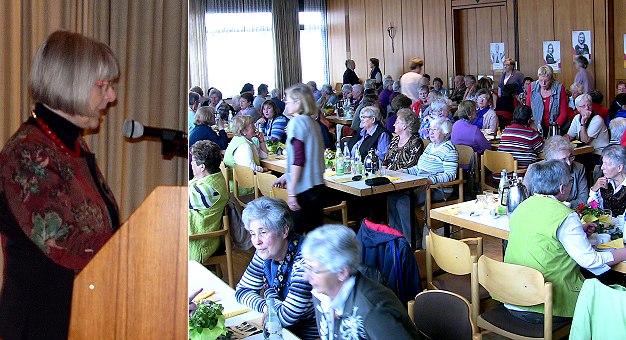 Mittelpunkt der Veranstaltung war ein Vortrag von Dr. Adelheid von Hauff, Dozentin für evangelische Theologie und Religionspädagogik, zum Thema "Frauen um Dietrich Bonhoeffer" (Bild links). Der 1906 in Breslau geborene Bonhoeffer war Theologe und aktiver Widerstandskämpfer gegen den Nationalsozialismus. Er wurde am 9. April 1945 im Konzentrationslager in Flossenbürg ermordet. Zu Lebzeiten wurde er bei seiner Arbeit als Widerstandskämpfer von Frauen unterstützt. In ihrem Referat durchleuchtete Hauff die Arbeit dieser Frauen, allen voran der Großmutter Julie Bonhoeffer, seiner Mutter Paula sowie seiner Zwillingsschwester Sabine.