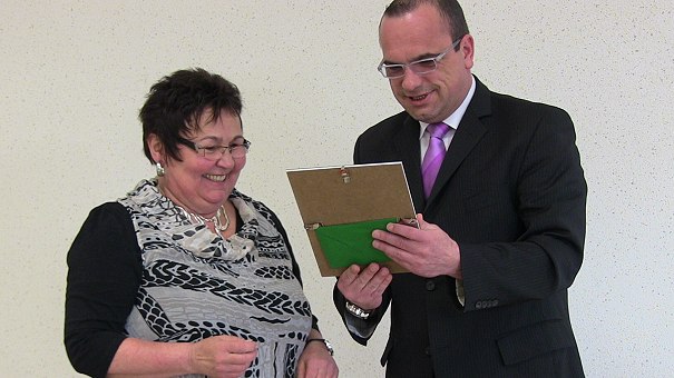 Windkraft war wieder Thema im Gemeindeparlament Ursula Verbrugge wurde von Bürgermeister Jan Frey für 25-jährige Tätigkeit im Öffentlichen Dienst geehrt. (Foto: Hubert Richter)(hr) Am vergangenen Freitagabend tagte der Schönbrunner Gemeinderat im Bürgersaal des Rathauses. Er befasste sich unter anderem mit dem neuen Flächennutzungsplan für Windenergieanlagen.
