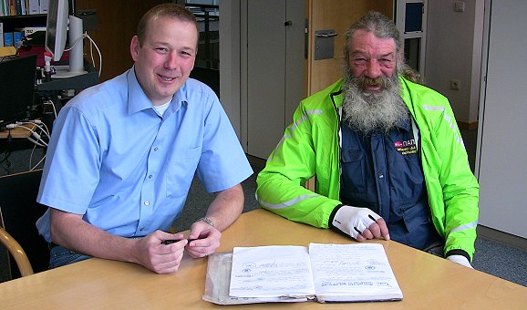 Am frühen Morgen stand der Mann mit grauen, langen Haaren, die zu einem Zopf zusammengebunden waren, einem wilden Bart und wettergegerbtem Gesicht in der Kellereistraße in Eberbach. Mit dabei hatte er ein Fahrrad, das mit Taschen und Plastiktüten schwer bepackt war. Er, Christian van Limbergen, störte sich nicht an den oft auffälligen Blicken der an ihm vorbeigehenden Bürgerinnen und Bürgern, er scheint das gewohnt zu sein. Sein Ziel war das Rathaus. Dort holte er sich von Hauptamtsleiter Arndt Zimmermann einen Stempelabdruck ab, der bestätigte, dass er heute in Eberbach Station gemacht hat.