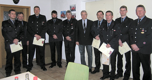 Unter dem Punkt Beförderungen wurden Hans-Peter Steck, Volker Wieland, Mathias Schmitt und Steffen Edelmann zum Hauptfeuerwehrmann ernannt. Timo Bachert konnte nach Abschluss des Gruppenführerlehrgangs an der Landesfeuerwehrschule in Bruchsaal zum Löschmeister befördert werden. Bürgermeister Schölch bedankte sich bei den Kameraden für ihre Bereitschaft zur Unterstützung der Abteilungswehr.