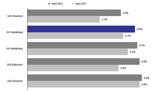 Arbeitslosigkeit leicht gestiegen Arbeitslosenquoten im April. (Grafik: Bundesagentur für Arbeit)(bro) (aa) Ende April waren im Bezirk der Agentur für Arbeit Heidelberg 9.965 Menschen arbeitslos gemeldet - 254 mehr als im März, 1.054 mehr als vor einem Jahr. Die Arbeitslosenquote im Gesamtbezirk stieg um 0,1 auf 4,6 Prozent. Vor einem Jahr waren es 4,1 Prozent.