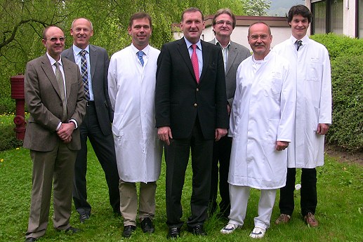 Künftig in Eberbach zwei chirurgische Abteilungen V.l. Martin Hildenbrand, Rüdiger Burger, Dr. Thomas Simon, Professor Dr. Markus W. Büchler, Michael Spiegelberg, Dr. Helmut Reinhard und Dr. Thorsten Löffler (Foto: Claudia Richter)(cr) Um den Krankenhausstandort Eberbach nachhaltig zu sichern, machen sich Geschäftsführer und Ärzte immer wieder Gedanken über Aufgaben und Strukturen. Jetzt wurde eine Neuordnung der Chirurgie in Angriff genommen.