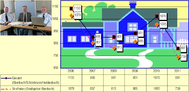 Im Zuständigkeitsbereich der Eberbacher Beamten liegt die Gesamtzahl der registrierten Straftaten im Jahr 2011 mit 807 (Vorjahr 1070) aus der Sicht der Langzeitbetrachtung auf einem sehr niedrigen Wert. Für den Bereich der Stadt Eberbach wurden 739 (1005), für Schönbrunn 58(59) und für Heddesbach 10(6) Fälle notiert.