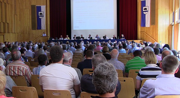Bezahlbare Mieten nur bei Abriss und Neubau - Entscheidung soll im Juni fallen Rund 400 Mitglieder und interessierte Gäste kamen in die Stadthalle. (Foto: Hubert Richter)Mehr Bilder (Klicken zum Vergrößern):