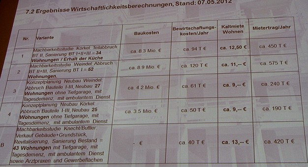 Bezahlbare Mieten nur bei Abriss und Neubau - Entscheidung soll im Juni fallen Gegenüberstellung der Varianten auf Großbildwand unter Wirtschaftlichkeitsgesichtspunkten. (Foto: Hubert Richter)Mehr Bilder (Klicken zum Vergrößern):