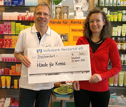 300 Euro für die Ärmsten der Armen (Foto: privat)(bro) (fk) "Taler sammeln - Gutes tun" - unter diesem Motto haben die Kunden der Bahnhof Apotheke nach Erhalt eines oder mehreren Talern des Bonus-Systems der Apotheke die Möglichkeit, statt den Bonustaler in eine der vielen Prämien einzutauschen, diesen unter anderem auch in die Taler-Box für den Verein „Hände für Kenia“ zu werfen.