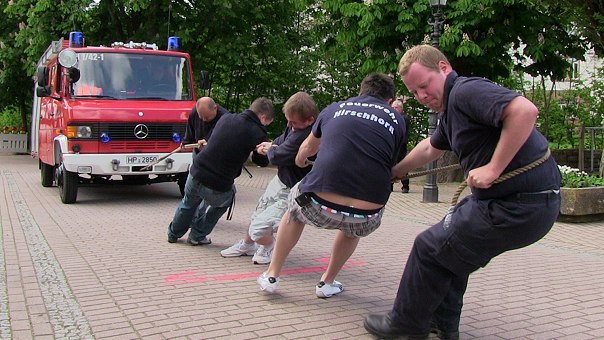 Spannend war der Wettbewerb, bei dem Feuerwehrteams ein Einsatzfahrzeug mit dem Seil ziehen mussten. Für Unterhaltung sorgten zudem ein Laienschauspiel und ein fingierter Brandfall mit einer Nebelmaschine unmittelbar am Festgelände.