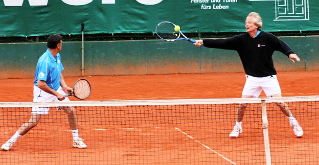Tennismannschaften liefern gute Ergebnisse Rolf Staguhn und Uwe Scherer. Erstes Doppel der Regionalliga Herren 55. (Foto: privat)(bro) (sch) Tennis vom Feinsten boten einmal mehr die Regionalliga Herren 55. Noch nie war die Mannschaft unter Lothar Schmitt mit einem 3:3-Zwischenstand so nahe daran, ihren Angstgegner aus Eschborn zu packen. Leider konnte nur ein Doppel zum knappen 4:5-Endstand punkten.