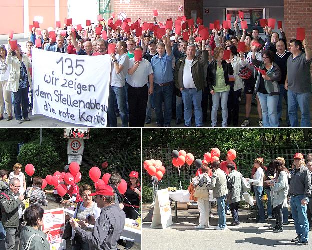 Scherer-Belegschaft zeigt geplantem Personalabbau die Rote Karte (Fotos: privat)(bro) (kw) Die Belegschaft und der Betriebsrat von R. P. Scherer / Catalent Pharma Solutions haben gemeinsam in zwei Aktionen am Montag, 14. Mai, unter dem Motto: „135 - Wir zeigen dem Stellenabbau die Rote Karte“ ihren Protest gegen den geplanten Abbau von 135 Vollzeitstellen im Gammelsbachtal eindrucksvoll demonstriert.