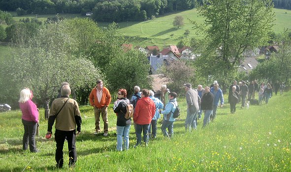Das begangene Teilstück führte die Gruppe vom Gemeindezentrum aus, über die Grillhütte an Hanmichelsbuckel zum Sensbacher Friedhof. Auf diesem Teilstück konnten die Teilnehmer von Ehrenbürgermeister Manfred Heiss und Revierförster Erich Kuhlmann Informationen zum “Sensbacher Kirchenpfad”, der Geschichte des Sensbacher Friedhofs und anderen Besonderheiten entlang des Weges erfahren. Vom Sensbacher Friedhof führte die Route dann über den “Buckelwirtspfad” zum Anwesen von Erich Kaufmann (Buckelwirt), wo im Hof eine Rast eingelegt wurde. Anschließend führte der Weg dann über die östliche Talseite entlang des Radweges Würzberg - Gaimühle zurück zum Gemeindezentrum. Unterwegs konnten an vielen Stellen, insbesondere am Pilz, noch herrliche Ausblicke in die aufblühende Natur und das Sensbachtal genossen werden.