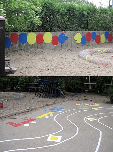 In Eigeninitiative wurden Ideen gesammelt und an mehreren Terminen dann umgesetzt. So wurden die im Hof sichtbaren Wände von Unrat und Dreck befreit und mit neuen Motiven in frischen Farben bemalt. Zwei neue Hüpfspiele, ein Wurfspiel und ein Zug zieren den Boden. Zudem gibt es nun eine Straße mit verschiedenen Verkehrsschildern, die die Kinder mit ihren Fahrzeugen benutzen können. Die Kinder haben die Eltern tatkräftig unterstützt, den Kindergarten wieder auf Vordermann zu bringen. Sie strichen das Eingangstor in schönen bunten Farben und halfen bei den Arbeiten, wo sie nur konnten. Neben den Verschönerungen wurden auch diverse Ausbesserungen vorgenommen. Es wurden das Klettergerüst und einige Holztische und Holzbänke mit neuer Holzlasur bearbeitet sowie die Regenrinnen und das Dach von Unrat beseitigt. Zusammen mit einer Erzieherin wurde ein Bohnenzelt aufgestellt, aus dem die Kinder nun schon bald ihre eigenen Bohnen ernten können.