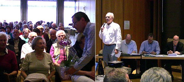 Bürgerinitiative will die Vereinsmitglieder mobilisieren Ein Blumenpräsent gab es für B.I.S.S.-Gründerin Else Sommer (vorne Mitte), die B.I.S.S. von Anfang an auch finanziell unterstützt hat. (Fotos: Claudia Richter)(cr) Zu einer Informationsveranstaltung lud gestern die Bürgerinitiative Schmeißer-Stift (BISS) ein. Besprochen wurden unter anderem mögliche Nutzungsvarianten für das ehemalige Altersheim in der Luisenstraße in Eberbach, die am vergangenen Freitag den Mitgliedern und der Öffentlichkeit vorgestellt wurden (wir berichteten).