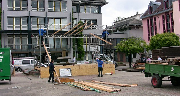 Drei Tage Hochbetrieb auf Straßen und Plätzen Aufbauarbeiten auf dem Leopoldsplatz. (Foto: Claudia Richter)(cr) Am kommenden Wochenende wird in Eberbach zum 33. Mal das Frühlingsfest gefeiert. Von Freitag, 18. Mai, bis Sonntag, 20. Mai, werden Besucher in der Innenstadt kulinarisch und kulturell verwöhnt. Außerdem gibt es auf dem Alten Markt, dem Neuen Markt, dem Lindenplatz und im Dr.-Weiß-Schulhof Livemusik. Für Samstag, 19. Mai, organistierten die Veranstalter ein Public-Screening des Champions-League-Spiels.
