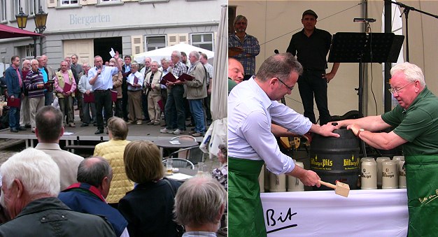 Um 18.30 Uhr durfte auf dem Alten Markt kräftig mitgesungen werden, als der aus dem MGV Concordia Neckarwimmersbach und dem MGV Sängerlust Rockenau vereinigte Chor unter Leitung von Tobias Soldner bekannte Frühlingslieder anstimmte. Begleitet wurde die Sängerschar von der Katholischen Pfarrkapelle unter Leitung von Gustav Rumstadt. Soldner erläuterte den Zuhörern das Programm des Frühlingsfestes, das noch bis Sonntag, 20. Mai, andauert (wir berichteten).