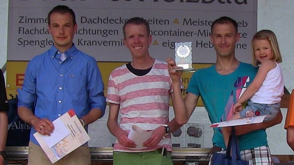 Eberbacherin Zweitschnellste im Halbmarathon Siegerehrung Halbmarathon, v.l. David Spranz, Holger Freudenberger und Sieger Maciek Miereczki mit Tochter Natalia. (Foto: Hubert Richter)Mehr Bilder (Klicken zum Vergrößern):