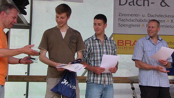 Eberbacherin Zweitschnellste im Halbmarathon Hauptorganisator Frank Knecht bei der Siegerehrung für den 10-km-Lauf mit Maximilian Pfau, Manuel Boch und Stephan Hagelmayer (v.l.). (Foto: Hubert Richter)Mehr Bilder (Klicken zum Vergrößern):