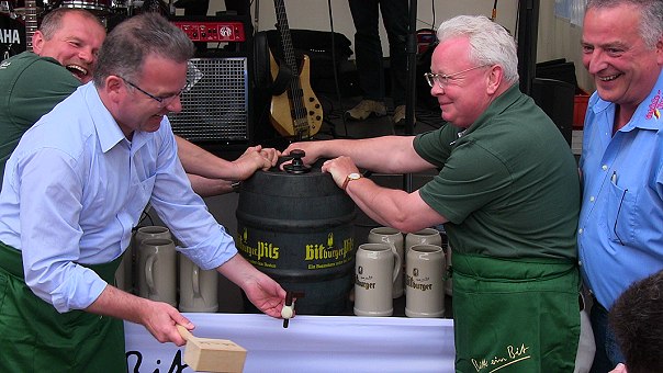 Festmarathon für Partyfans und Halbmarathon für Sportsfreunde Fassbieranstich durch Bürgermeister Bernhard Martin am Freitagabend auf dem Neuen Markt. (Foto: Hubert Richter)Mehr Bilder (Klicken zum Vergrößern):
