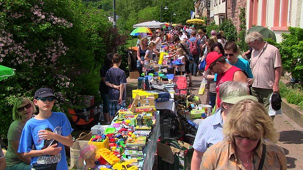 Auch wenn der Kinderflohmarkt am Samstagnachmittag nicht mehr ganz so groß war wie früher, nutzten viele Besucher das reichhaltige Angebot an den Ständen für einen Bummel durch die Altstadt. Die Kantoren Achim Plagge und Godehard Weithoff sammelten gestern Nachmittag zusammen mit Hartmut Tramer und seiner großen Viscount-Orgel, die sie auf einem Kleinlaster durch die Straßen chauffierten und an bestimmten Orten spielten, Geld für die Renovierung der Orgeln in den Eberbacher Stadtkirchen. Eine weitere Benfizaktion hatten Azubis und Studenten der GELITA AG gestartet, indem sie eine Tombola zu Gunsten des Paulusheims in Eberbach durchführten, bei der jedes Los gewann.