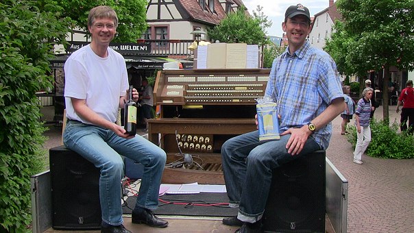 Festmarathon für Partyfans und Halbmarathon für Sportsfreunde Zwei Kantoren - eine Mission: Godehard Weithoff (l.) und Achim Plagge am Samstagnachmittag auf dem "Orgeltruck" zu Gunsten der Orgelrenovierung in Eberbach. (Foto: Hubert Richter)Mehr Bilder (Klicken zum Vergrößern):