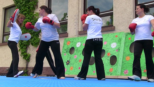 Festmarathon für Partyfans und Halbmarathon für Sportsfreunde Tae Bo Vorführung am Samstagnachmittag im Hof der Dr.-Weiß-Schule. (Foto: Hubert Richter)Mehr Bilder (Klicken zum Vergrößern):