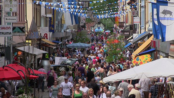 Seit der Eröffnung am Freitagabend (wir berichteten) reihten sich zahlreiche Programmpunkte aneinander (siehe Bilder), und die Geselligkeit feierte fröhliche Urständ'. Das Wetter spielte eigentlich gut mit. Zwar tröpfelte es am Freitagabend ab und zu, aber lediglich während des Champions-League-Finalspiels am gestrigen Samstagabend kam ein längerer Regenguss mit Blitz und Donner nieder. Das Spiel wurde auf dem Leopoldsplatz auf Großleinwand gezeigt, und wer sich nicht rechtzeitig ein Plätzchen unter einem Dach oder Schirm gesichert hatte, wurde ordentlich nass.
