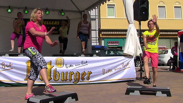Festmarathon für Partyfans und Halbmarathon für Sportsfreunde Step Aerobic vom SV Moosbrunn am Sonntagnachmittag auf dem Neuen Markt. (Foto: Hubert Richter)Mehr Bilder (Klicken zum Vergrößern):