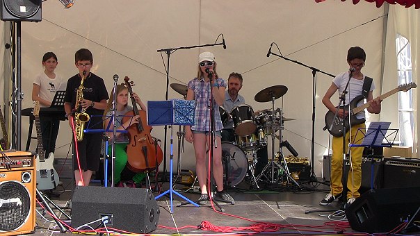 Festmarathon für Partyfans und Halbmarathon für Sportsfreunde Die Rockband des Hohenstaufen-Gymnasiums am Sonntagnachmittag auf dem Lindenplatz. (Foto: Hubert Richter)Mehr Bilder (Klicken zum Vergrößern):