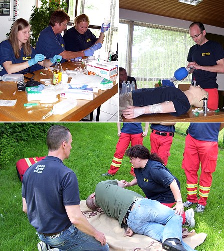 Der Lehrgang am Samstag wurde von zwei Profis geleitet: von Dr. Ulf Mieck aus Eberbach sowie von einem Sanitäter aus den eigenen DLRG-Reihen, Matthias Frick aus Leimen. Von Maßnahmen bei möglichen Unfällen im Freibad über Sonnenstich oder Überforderung beim Frühlingslauf bis zum Anbringen von Verbänden oder Anreichung von Infusionsmaterial für den Arzt an einem Unfallort reichten die Lehrinhalte. Aber auch aufwendige Rettungsmaßnahmen, wie das Einbringen eines Larynxtubus, wurden geübt. Hierbei wird einem Bewusstlosen ohne Atmung ein Tubus über den Mund in die Speiseröhre geführt, um die Atmung im Rahmen der Herz-Lungen-Wiederbelegung zu erleichtern. In einer praktischen Übung im Außenbereich wurde nachgestellt, was beim Auffinden einer Person am Boden zu tun ist. Vom Notruf absetzen über Blutdruck messen und dem Herausfinden, was der Person fehlt, bis zur Durchführung der stabilen Seitenlage bei Bewusstlosigkeit wurden alle Möglichkeiten durchgespielt.