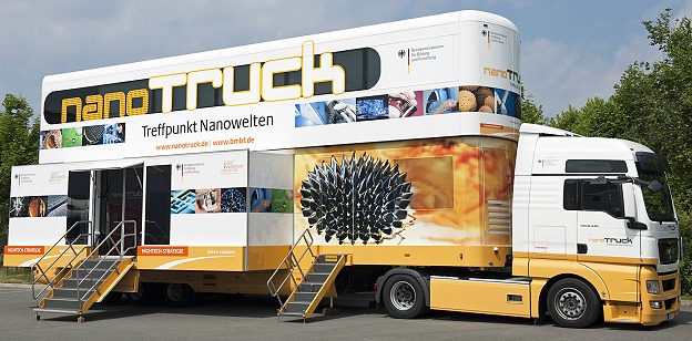 Wer wissen will, was „nano“ bedeutet und was sich genau hinter dieser Querschnittstechnologie verbirgt, dem bietet das doppelstöckige Ausstellungsfahrzeug mit interaktiver Exponatschau, Laborbereich für Workshops und Informationen zu Ausbildung, Studium und Beruf eine Menge hilfreicher Antworten. Im Rahmen von Präsentationen und einem speziellen Workshop erfahren Schülerinnen und Schüler, was Materiestrukturen, die millionenfach kleiner sind als ein Stecknadelkopf, zur Lösung wichtiger Zukunftsfragen beitragen können.