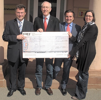 3.000 Euro zur Unterstützung der Zwingenberger Schlossfestspiele (Foto: privat)(bro) (sch) Mit Werner Kley und Christoph Grüber (Mitte v. li.) haben sich die Geschäftsführer gleich zweier Bezirksdirektionen von Toto-Lotto Baden-Württemberg – nämlich Rhein-Neckar Odenwald und Franken - die Zeit genommen, um Landrat Dr. Achim Brötel, der auch Vorsitzender der Zwingenberger Schlossfestspiele ist, einen Scheck in Höhe von 3.000 Euro zu übergeben. Geld, das mit dazu beitragen wird, auch die 30. Saison der Schlossfestspiele vom 3. bis 12. August zum kulturellen Höhepunkt werden zu lassen, wie der Landrat und Geschäftsführerin Heike Brock in ihren Dankesworten betonten.