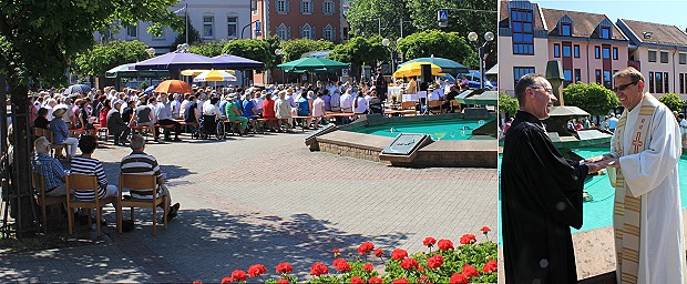 Kleiner Ökumenischer Katholikentag auf dem Leopoldsplatz Pfarrer Ekkehard Leytz(li.) und Pfarrer Pavo Ivkic luden die Gottesdienstbesucher zur Tauferneuerung an den Brunnen auf dem Leopoldsplatz ein.(Fotos:Wörner)(tw) Bei herrlichem Sonnenschein versammelten sich heute Morgen einige Hundert Eberbacher Christen zum ökumenischen Pfingstgottesdienst auf dem Leopoldsplatz.