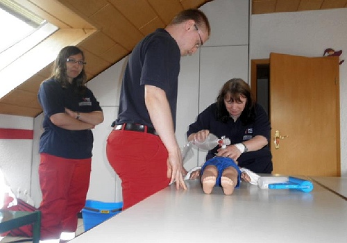 Hierzu wurde Anfang Mai durch die 3. Einsatzeinheit des Katastrophenschutzes, in der auch die Bereitschaft Eberbach aktiv ist, ein Reanimationstraining in Meckesheim durchgeführt. Einen ganzen Samstag lang wurden unter der Anleitung von zwei Ausbildern verschiedene Themen im Bereich der Reanimation erarbeitet und intensiv geübt. Hierbei konnten die Helferinnen und Helfer ihre Kenntnisse in der Reanimation von Säuglingen und Kleinkindern bis hin zu den Erwachsenen vertiefen. Der Umgang mit dem AED (Automatischer Externer Defibrillator) und die korrekte Anwendung des Larynxtubuses standen ebenso auf dem Programm wie das Vorbereiten von Injektionen und Infusionen. Ein weiteres Thema war der Umgang mit Angehörigen von Patienten bei Notfalleinsätzen.
