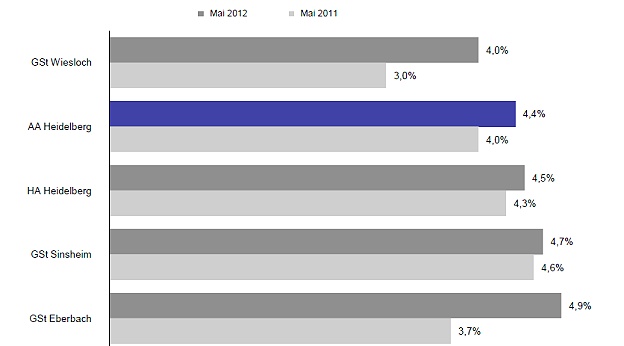 Für das Gebiet der Stadt Heidelberg wird eine Quote von 5,3 Prozent ausgewiesen und für den Rhein-Neckar-Kreis eine die Quote von 4,0 Prozent (Vorjahr: 3,8 Prozent).