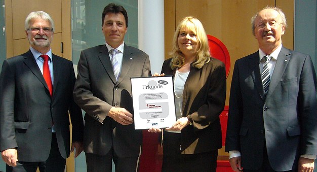 Stellvertretend Dunja Senges von der LBBW überreichte dieser Tage die Urkunde an den Vorstandsvorsitzenden, Sparkassendirektor Gerhard Stock, und gratulierte zum sehr guten Ergebnis.