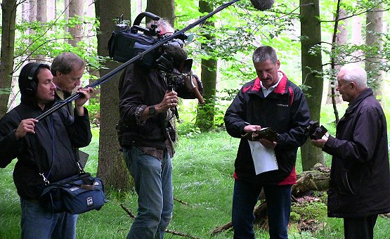 Zeitzeuge berichtet über Flugzeugabsturz Hans Klinge und Klaus Deschner (v.r.) mit Original-Wrackteilen des abgestürzten US-Jagdbombers bei den Dreharbeiten des SWR an der Absturzstelle im Eberbacher Stadtwald. (Foto: StVE)(cr) (stve) Klaus Deschner aus Waldbrunn hat ein außergewöhnliches Hobby: Er dokumentiert Flugzeugabstürze und versucht, deren jeweilige Ursache und Hergang zu ergründen. Heute besuchte er mit dem Zeitzeugen Hans Klinge und einem Fernsehteam des SWR vom Studio Mannheim eine Absturzstelle im Eberbacher Stadtwald.