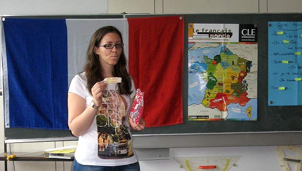 Nach einer Vorstellungsrunde – natürlich in französischer Sprache – konnten die Schülerinnen und Schüler ihre französischen Sprachkenntnisse bei dem Spiel „Faites la queue“ unter Beweis stellen. Den Abschluss der Schulstunde bildete ein Musik-Quiz bei dem es galt die Titel von französischen Liedern herauszuhören.