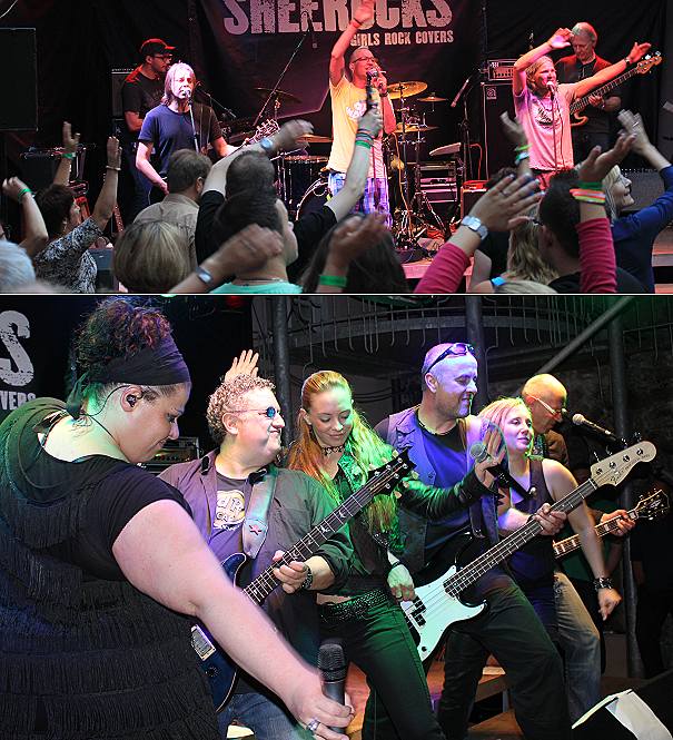 Auch bei Sheerocks aus Mannheim bestand kein Zweifel daran, warum man sie ein zweites Mal zum Rock im Klosterhof eingeladen hatte. Vom Publikum stürmisch begrüßt ging es sofort in die Vollen. Der Name war auch hier Programm und die Mädels von Sheerocks präsentierten "fast nur" Girls Rock Covers. Mit Titeln von Lenny Kravitz, Amy Mac Donald, Adele, den Eurythmics, Cyndi Lauper, Melissa Etherige und KT Tunstall konnten die drei Rockröhren ihre Stärken zeigen. Für die Engländerin bei Sheerocks, Kate Dowle, hatten die Kolleginnen einen französischen Titel (Je Veux/Zaz) ausgesucht, Frontfrau Barbara Boll animierte zu Laola-Wellen und zum Mitsingen und bei Kung Fu(Carl Douglas) gab es Schattenboxen im Klosterhof. Nach einer Pause legten Sheerocks nochmals einen Zahn zu u.a. mit Titeln von AC/DC (Hells Bells, Shook me all night long u. Highway to Hell). Aber auch bei "Dancing Queen" (Abba) oder "Those were the days" (Mary Hopkins) ging das Publikum voll mit. Nach einigen Zugaben, von der Uhrzeit schon zu spät, aber für die meisten Zuhörer noch viel zu früh wurden Sheerocks von der Bühne entlassen.