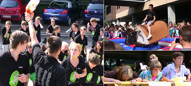 Ruhe kehrte nur kurzzeitig im Gefängnisbereich ein, während nämlich die frischgebackenenen Abiturienten mit einem Autokorso auch die Menschen in der Eberbacher Innenstadt auf ihre bestandenen Prüfungen mit Hupen und Trillerpfeifen hinwiesen. Die ABIs trauten sich im Anschluss wieder in ihr Hochsicherheitsgefängnis, denn ganz nach ihrem diesjährigen Motto "AliBI - jeder will eins, wir haben es", kann ihnen am HSG nichts mehr passieren. Sie erklärten sich am Vormittag aber solidarisch mit den restlichen Insassen, befreiten diese bei der Stürmung aus ihren Klassenzimmern und luden die erlösten Schülerinnen, Schüler und Lehrer zu einer Fete im Schulhof ein, bei der für Musik, Spiel und Spaß gesorgt war.