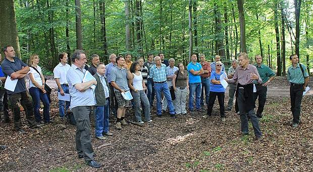 Nach dem theoretischen Teil im Rathaus ging es mit dem Bus hinaus in den Wald. An zwei Orten oberhalb des Gammelsbachtals wurden naturschutzrelevante Bestände gezeigt. In einem Fall handelte es sich um einen ehemaligen Eichen-Niederwald, in dem sich die seltene Bechsteinfledermaus wohlfühlt, und im anderen Fall um ein Buchen-Altholz mit zahlreichen Baumhöhlen, die gleich mehrere Tier- und Vogelarten nutzen. Letzterer Bestand wurde als so genanntes "Waldrefugium" ausgewiesen, in dem die Holzernte ruht.