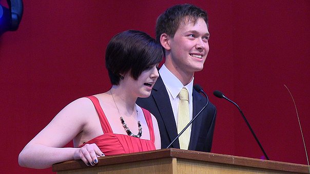Doppeljahrgang zwang zum Ausweichen in die Sporthalle Die Abiturientensprecher Verena Dillmann und Thomas Geier. (Foto: Hubert Richter)Mehr Bilder (Klicken zum Vergrößern):