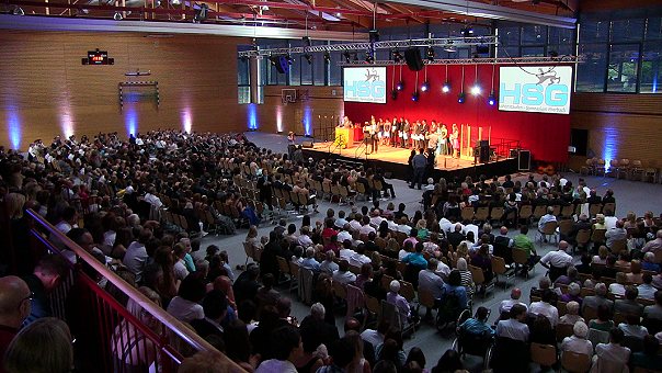 (hr) 160 Abiturienten des Hohenstaufen-Gymnasiums Eberbach (wir berichteten) erhielten gestern Abend ihre Abschlusszeugnisse. Die Feier fand wegen des Doppeljahrgangs aus G8 und G9 nicht wie gewohnt in der Stadthalle, sondern in der Hohenstaufen-Sporthalle statt, die aber die Feuerprobe mit Bravour bestand.
