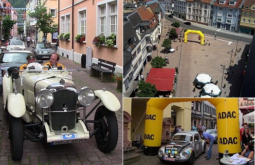 Technikgeschichte auf Rädern Links das älteste Fahrzeug, ein Rover aus dem Baujahr 1933. Rechts oben: Der Neue Markt war ein Startpunkt am Nachmittag. Unten: Start am Alten Markt mit Moderator Ralf Pietsch. (Fotos: Hubert Richter / Maren Richter)(hr) Freunde historischer Autos kamen gestern bei der "Eber Rallye Classic" in Eberbach und im Odenwald auf ihre Kosten.