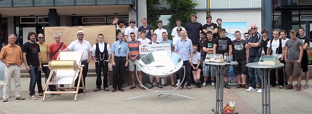 Klimaschutzprojekt Beating the Heating wurde abgeschlossen Partnerschüler und -lehrer aus England und Spanien zusammen mit den Eberbacher Zimmererschülern und Projektinitiator Fabian Fahr (5. v. li., Schulleiter Martin Staniczek (7. v.li) und Abteilungsleiter Toni Dausch (1. v.li.) mit ihren solaren Kochgeräten vor dem Eberbacher Rathaus. (Foto: privat)(bro) (rod) Zu einem einwöchigen Workshop trafen sich Auszubildende und Lehrer aus England und Spanien als Klimabotschafter an der Theodor-Frey-Schule, um dort im Rahmen des europäischen Bildungsprogrammes Leonardo da Vinci ihr gemeinsames Klimaschutzprojekt „Beating the Heating“ abzuschließen (wir berichteten.)