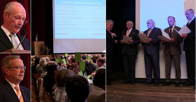 Solides Wachstum trotz Krise bringt gute Dividende Links oben der Aufsichtsratsvorsitzende Gunter Mayer, unten Vorstandsvorsitzender Ekkehard Saueressig. Mitte die Abstimmung über die Überschussverwendung der Volksbank Neckartal. Rechts die geehrten Aufsichtsratsmitglieder mit Dietrich Herold. (Fotos: Hubert Richter)(hr) Bei der Vertreterversammlung der Volksbank Neckartal eG berichtete der Vorstand heute Abend in der Eberbacher Stadthalle über das Geschäftsjahr 2011. Außerdem standen Aufsichtsratswahlen und eine Satzungsänderung auf der Tagesordnung.