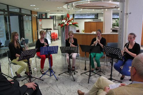 Nicht zu Unrecht erwähnte Sparkassendirektor Gerhard Stock bei seiner Begrüßung, dass das Publikum hohe Erwartungen haben dürfe, denn auch in diesem Jahr waren wieder einige Preisträger von "Jugend musiziert" anwesend und gaben ihr Können zum Besten. Beim Talentforum werden in jedem Jahr junge Musiker und Musikerinnen aus Eberbach, Buchen, Mosbach und Walldürn vorgestellt, die von der Sparkassenfinanzgruppe finanziell sowie mit Sonderpreisen, Stipendien und Konzerten, insbesondere für die Teilnahme an regionalen Wettbewerben unterstützt und in Kooperation mit den Musikschulen gefördert werden. In diesem Jahr durften sich die Gäste von den Klarinetten-Klängen der „Flotten Klappen“ verzaubern lassen. Ralph Schweizer von der Musikschule Eberbach führte geschickt durch das musikalische Programm und erläuterte den Zuhörern die Vielfalt der Klarinetten sowie die einzelnen Musikstücke. Bei einer geographischen Reise von Ungarn über Argentinien bis Afrika zogen die fünf Preisträgerinnen von "Jugend musiziert 2011" mit Marlena Melzer, Magdalena Plagge, Tanja Wilbrandt, Pauline Schneider und Sophia Schweizer die Zuhörer in ihren Bann.