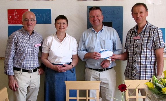 Zehn Jahre Tagesgruppe V.l.: Georg Blasel, pädagogischer Leiter, Vorstand Dr. Brigitte Spannagel-van Kaick, Bürgermeister Bernhard Martin und Wolfgang Roesch, Leiter der Tagesgruppe in der Zwingerstraße. (Foto: Doris Lenz)(dl) Anlässlich ihres zehnjährigen Bestehens feierte am vergangenen Samstag die Tagesgruppe des St. Paulusheims ein Fest.