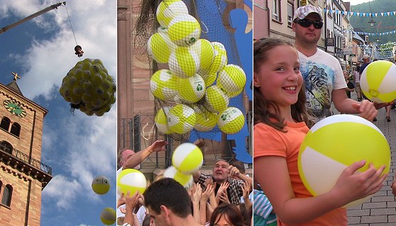 Zum Start der Foto-Aktion "Sommer - Sonne - Wasserball" (wir berichteten) sollten um 19.30 Uhr an der Michaelskirche jede Menge EWG-Wasserbälle vom Himmel fallen. Ein großer Kranwagen stand bereit, an dem das Netz mit den Bällen hing. Zahlreiche Kinder hatten sich darunter versammelt und warteten gespannt auf den Ballregen. Doch die Technik versagte, und so musste das Netz am Boden von Hand geöffnet werden. Die Bälle fanden trotzdem reißenden Absatz, und man darf auf die fotografischen Ergebnisse gespannt sein.