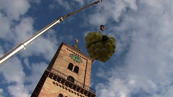 Zum Start der Foto-Aktion "Sommer - Sonne - Wasserball" (wir berichteten) sollten um 19.30 Uhr an der Michaelskirche jede Menge EWG-Wasserbälle vom Himmel fallen. Ein großer Kranwagen stand bereit, an dem das Netz mit den Bällen hing. Zahlreiche Kinder hatten sich darunter versammelt und warteten gespannt auf den Ballregen. Doch die Technik versagte, und so musste das Netz am Boden von Hand geöffnet werden. Die Bälle fanden trotzdem reißenden Absatz, und man darf auf die fotografischen Ergebnisse gespannt sein.